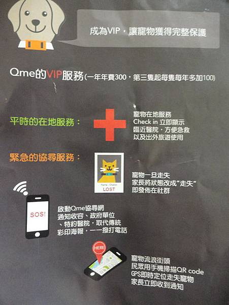 Qme的則是免費功能有寵物社群和掃QR Code就會顯示寵物資料,如果需要定位就要用VIP功能,但VIP功能包含了定位通知以外,還有萬一有狀況可以立即搜尋附近的動物醫院、走失時立即通知協尋網上的政府、收容所、特約醫院功能就多很多,這部分一年的費用是三百元,這部分的原因請詳細閱讀Qme 免費吊牌與加值服務 就會知道她們的苦心囉。(2013/12月底前註冊免費升級VIP一年)