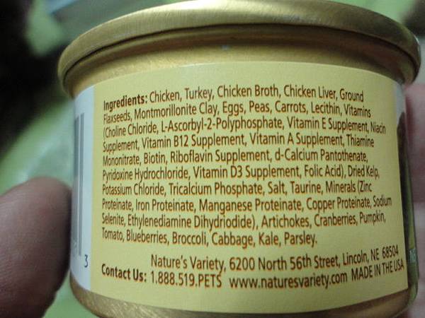 Chicken, Turkey, Chicken Liver, Chicken Broth, Ground Flaxseed, Montmorillonite Clay, Eggs, Peas, Carrots, Lecithin, Dried Kelp, Potassium Chloride, Salt, Minerals (Zinc Proteinate, Iron Proteinate, Copper Proteinate, Manganese Proteinate, Sodium Selenite, Cobalt Proteinate, Potassium Iodide), Vitamins (Vitamin E Supplement, Thiamine Mononitrate, Niacin Supplement, d-Calcium Pantothenate, Pyridoxine Hydrochloride, Riboflavin Supplement, Vitamin A Supplement, Biotin, Vitamin D3 Supplement, Vitamin B12 Supplement, Folic Acid), Taurine, Choline Chloride, L-Ascorbyl-2-Polyphosphate, Artichokes, Cranberries, Pumpkin, Tomato, Blueberries, Broccoli, Cabbage, Kale, Parsley