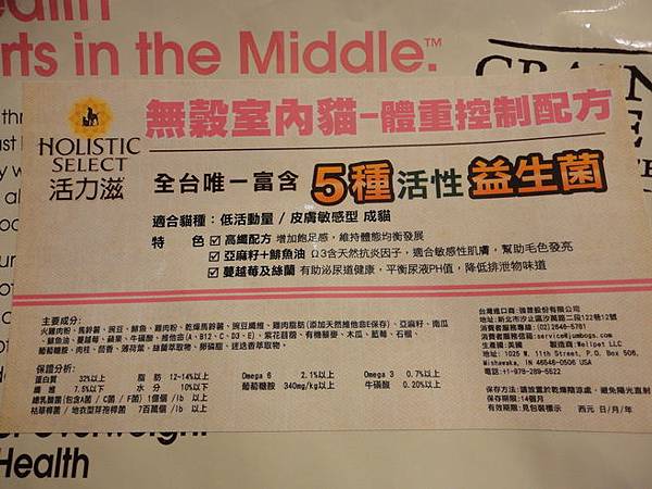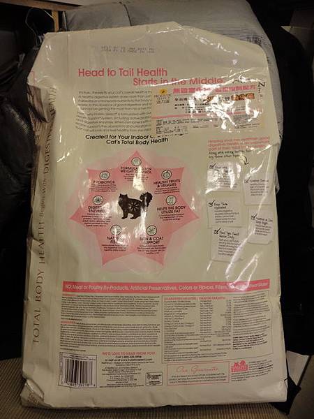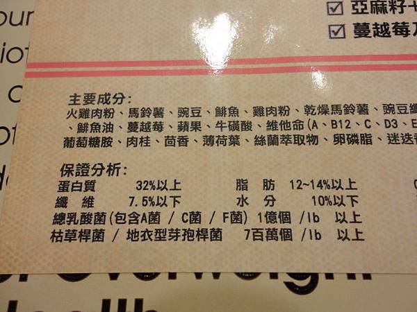 雞肉粉,研磨糙米,雞脂(以混合生育酚保存),燕麥粉,鯡魚與沙丁魚油,亞麻籽,乾蛋製品,天然雞肉香料,胡蘿蔔,南瓜,鯡魚油,蔓越莓,蕃茄渣,乾苜蓿粉,乾甜菜漿,蘋果,氯化膽鹼,鹽,豌豆,氯化鉀,藜麥,牛磺酸,菊粉,礦物質(鋅多醣複合物,鐵多醣複合物,銅多醣複合物,錳多醣複合物,亞硒酸鈉,碳酸鈷,碘化鉀,維生素(β-胡蘿蔔素,維生素E,維生素A補充劑,抗壞血酸(維生素C),D-泛酸鈣,核黃素,鹽酸吡哆醇,硫胺素,維生素D3,生物素,維生素B12,葉酸),木瓜,乾海帶,藍莓,DL-蛋氨酸,石榴,鹽酸鹽葡萄糖胺,添加混合生育酚保持新鮮,研磨肉桂,研磨茴香,研磨薄荷,絲蘭萃取物,乾嗜酸乳桿菌發酵產品,乾乳桿菌發酵產品,乾腸球菌發酵產品,乾枯草芽孢桿菌發酵產品,乾地衣芽孢桿菌發酵產品,乾米麴菌霉發酵產品,乾黑麴菌發酵產品,卵磷脂,迷迭香萃取物