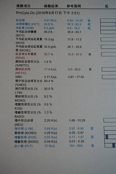 血小板(PLT)也從123掉到72 (正常值151-600)