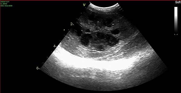 雙側的腎臟囊泡也變嚴重,現在已經無法計算大小和數量了