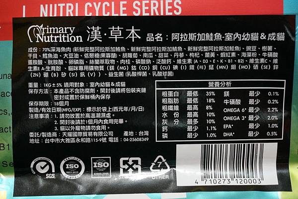 70%深海魚肉(新鮮完整阿拉斯加鮪魚、新鮮完整阿拉斯加鯖魚、新鮮完整阿拉斯加鮭魚)、碗豆、樹薯、干貝、鱈魚油、大豆油、低聚醣(果寡醣)、胡蘿蔔、南瓜、甜菜、單蔘、枸杞、薑黃、蝦紅素、海藻粉、牛磺酸、蛋胺酸、胱胺酸、卵磷脂、絲蘭萃取物、肉桂、磷酸鈉、泛酸鈣、維生素(A、D3、E、K、B1、B2)、維生素C、維生素E A-生育酚、貓咪專用礦物質(鎂、鈷、銅、碘、鐵、錳、鉬、硒、鋅、硼、矽、釩)、益生菌(乳酸桿菌、乳酸球菌)