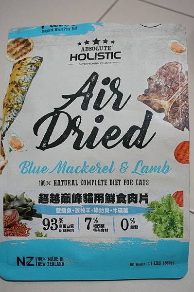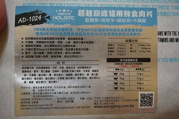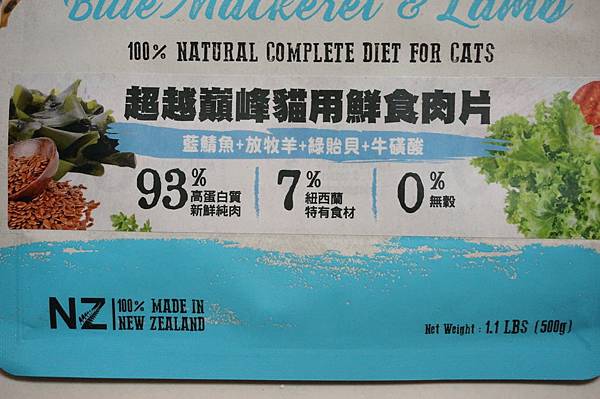 紐西蘭羊肉,紐西蘭藍鯖魚,羊肝,羊肺,蔬菜甘油,紐西蘭綠貽貝,德國菊苣,歐芹,氯化膽鹼,亞麻籽,紐西蘭/加拿大海帶,生育酚,碳酸鈣,鋅,牛磺酸,維生素E,鐵,維生素B3,硫酸銅,維生素B1,硒, 氧化錳,維生素B5,維生素A,維生素B2,生物素 (維生素H),維生素B6,維生素B12,碘,葉酸,維生素D3,維生素K