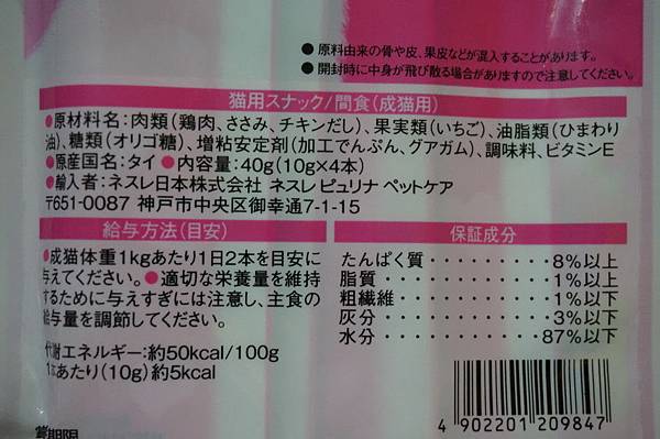 水、雞胸肉、雞里肌肉、草莓、增稠劑(修飾樹薯澱粉、關華豆膠)、香料、雞湯粉、葵花油、維生素E、果寡糖