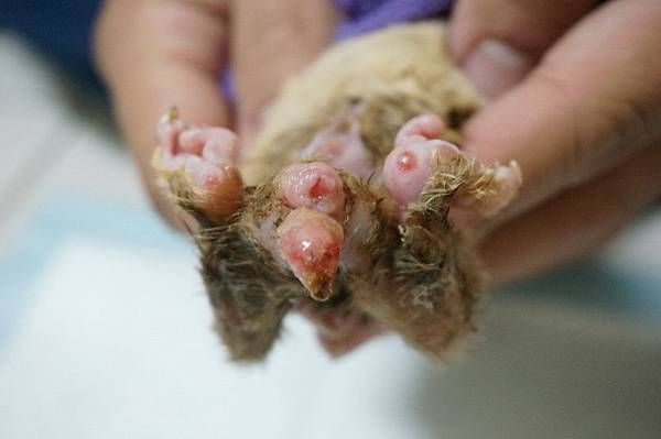 腳掌那圓形紅紅的地方是尿灼傷的意示圖(不過我覺得不適合噴在照片中尾巴那個傷口,有別的更適合的敷料)