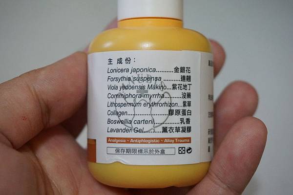 金銀花萃取液、連翹萃取液、紫花地丁萃取液、沒藥萃取液、紫草萃取液、乳香萃取液、薰衣草凝膠、膠元蛋白