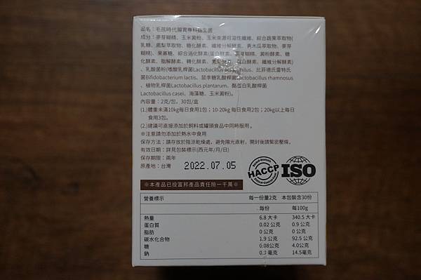 麥芽糊精、玉米澱粉、玉米來源可溶性纖維、綜合蔬果萃取物(乳糖、鳳梨萃取物、糖化酵素、纖維分解酵素、青木瓜萃取物、麥芽糊精)、果寡糖、綜合消化酵素(蛋白酵素、麥芽糊精、澱粉酵素、糖化酵素、脂解酵素、轉化酵素、鳳梨酵素、蛋白酵素、纖維分解酵素)、乳酸菌粉(嗜酸乳桿菌L.acidophilus acidophilus、比菲德氏雷特氏菌Bifidobacterium lactis、鼠李糖乳酸桿菌Lactobacillus rhamnosus、植物乳桿菌Lactobacillus plantarum、酪蛋白乳酸桿菌Lactobacillus casei、海藻糖、玉米澱粉)