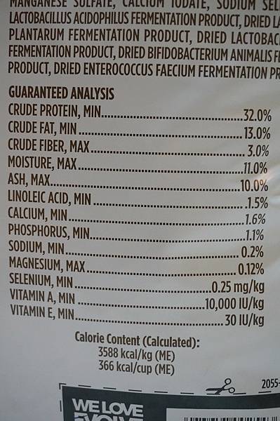 去骨雞肉,雞肉餐,糙米,珍珠大麥,豌豆,米糠,雞肉脂肪(保存混合生育酚),乾甜菜漿,亞麻籽餐,天然雞肉風味,鯡魚餐,乾蛋製品,氯化鉀,絲蘭提取物,乾海帶,乾菊苣根,藍苺乾,蔓越莓乾,酪梨,蘋果乾,胡蘿蔔乾,西洋芹,木瓜,菠菜,羽衣甘藍粉,維生素:(氯化膽鹼,維生素E補充劑,維生素A補充劑,維生素D3補充劑,菸酸,泛酸鈣,硫胺素單硝酸鹽(維生素B1來源),鹽酸吡哆醇(維生素B6來源),核黃素補充劑,葉酸,生物素,維生素B12補充劑),礦物質:(鋅多醣複合物,鐵多醣複合物,錳多醣複合物,銅多醣複合物,硫酸銅,硫酸錳,碘酸鈣,亞硒酸鈉),乾嗜酸乳桿菌發酵產品,乾雙歧桿菌動物發酵產物,乾羅伊氏乳桿菌發酵產物,乾屎腸球菌發酵產物