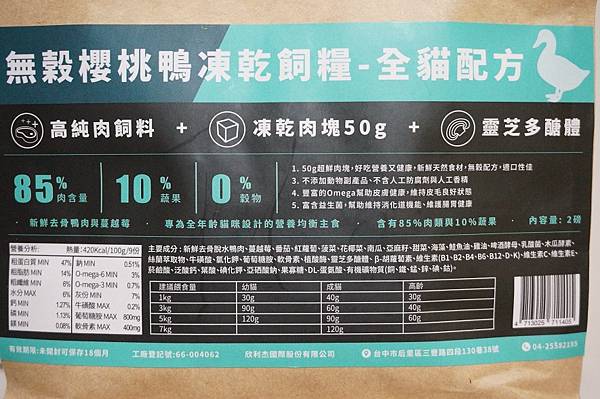 新鮮去骨凍乾台灣櫻桃鴨胸肉、台灣新鮮櫻桃鴨胸肉、蔓越莓、番茄、紅蘿蔔、菠菜、花椰菜、南瓜、亞麻籽、甜菜、海藻、水解山藥纖維、鮭魚油(EPA、DHA)、啤酒酵母、乳酸菌、MOS酵母、木瓜酵素、絲蘭萃取物、L-離胺酸、L-左旋肉鹼、牛磺酸、氯化鉀、葡萄糖胺、軟骨素、花青素、植酸酶、靈芝多醣體、β-胡蘿蔔素、維生素(B1、B2、B4、B6、B12、D、K)、維生素C、維生素E、菸鹼酸、泛酸鈣、葉酸、碘化鉀、亞硒酸鈉、果寡糖、DL-蛋氨酸、有機礦物質(銅、鐵、錳、鋅、碘、鈷)