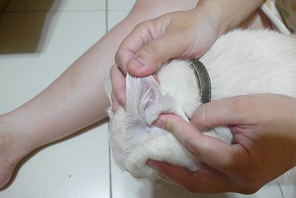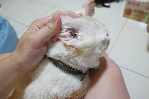 我很習慣一隻手將他們的耳朵輕輕提起,這樣動物的耳道會比較清楚看到