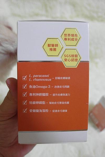 魚油粉、卵磷脂、褐藻粉、綜合胺基酸(麥芽糊精、L-麩胺酸、L-天冬胺酸、L-脯胺酸、L-白胺酸、甘胺酸、L-纈胺酸、L-離胺酸、L-異白胺酸、L-蘇胺酸、L-精胺酸、鹽酸L-組胺酸、L-苯丙胺酸、DL-甲硫胺酸、L-酪胺酸、L-色胺酸)、葡萄糖酸鋅、維生素E、菸鹼醯胺、玉米胚芽萃取(含神經醯胺)、泛酸鈣、維生素A、益生菌(Lactobacillus paracasei、Lactobacillus rhamnosus)、維生素B1、維生素B2、維生素B6、葉酸、生物素、維生素B12