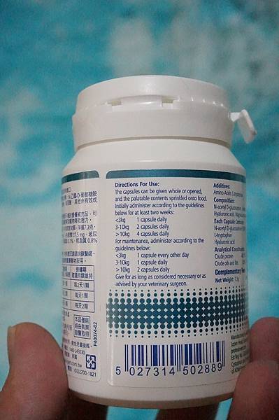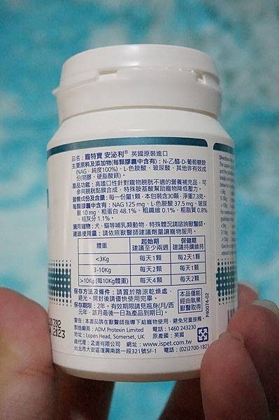 N-乙醯-D-葡萄糖胺(NAG,純度100%)、L-色胺酸、玻尿酸、其它非有效成份(明膠、硬脂酸鎂)