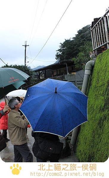 照片中的叔叔拿著他的單眼拍貓,一旁的家人(?)幫他撐傘