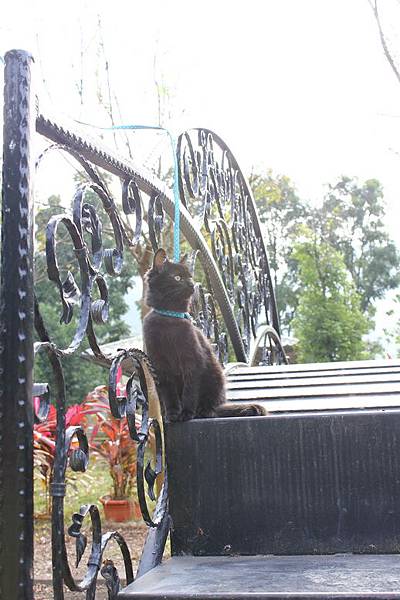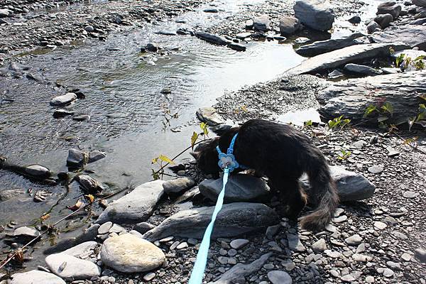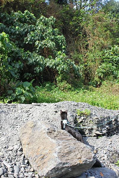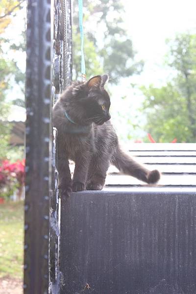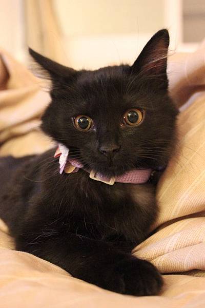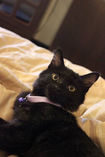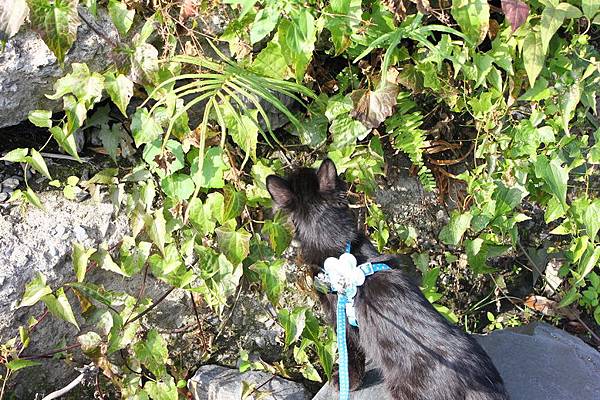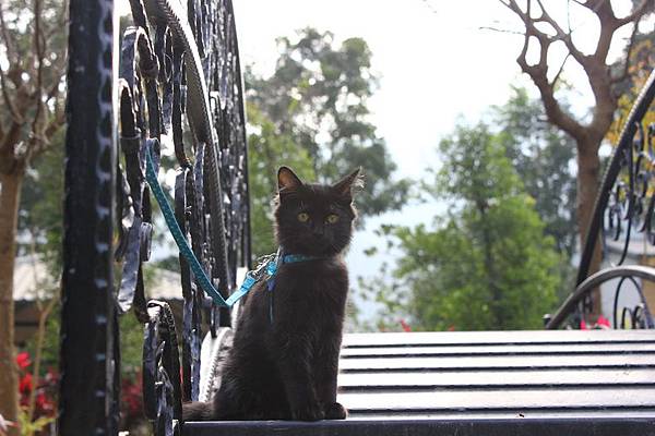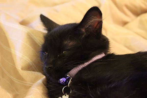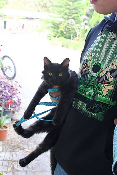 墨墨確實的上好有貓牌的項圈、外出牽繩、束口袋鼠背袋