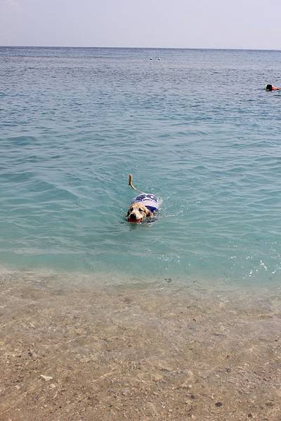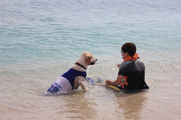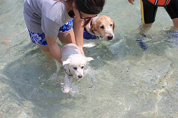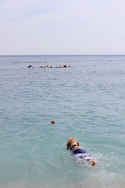 朋友很努力的幫我把岸邊守護犬瓜瓜抱到水中央